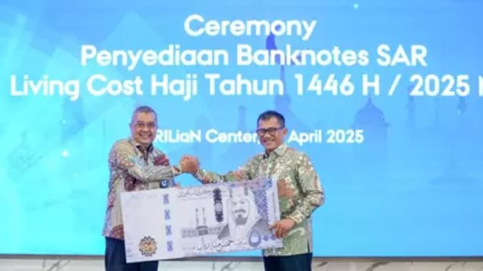 Badan Pengelola Keuangan Haji (BPKH) menyerahkan banknotes (uang tunai) ratusan juta dalam mata uang Saudi Arabian Riyal (SAR) sebagai bagian dari pemenuhan kebutuhan living cost bagi jemaah haji reguler tahun 1446 H/2025 M.