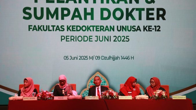 Fakultas Kedokteran Universitas Nahdlatul Ulama Surabaya (FK Unusa) kembali mengambil sumpah sebanyak 16 dokter baru, Kamis (5/6) siang. Pengambilan sumpah ini yang pertama setelah sebelumnya Prodi Kedokteran dan Profesi Dokter memperoleh akreditasi unggul dari Lembaga Akreditasi Mandiri Pendidikan Tinggi Kesehatan Indonesia (LAM-PTKes), awal Mei lalu.