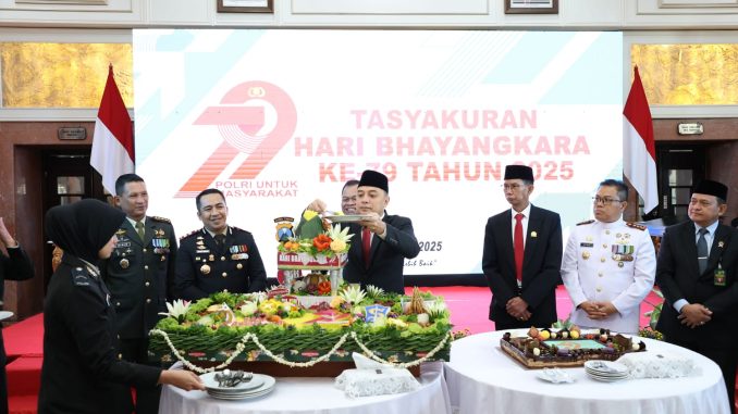 Upacara Hari Ulang Tahun (HUT) ke-79 Bhayangkara, digelar secara khidmat di Taman Surya, Balai Kota Surabaya, Selasa (1/7). Mengusung tema “Polri Untuk Masyarakat” upacara dipimpin langsung, oleh Kapolrestabes Surabaya, Kombes Luthfie Sulistiawan.