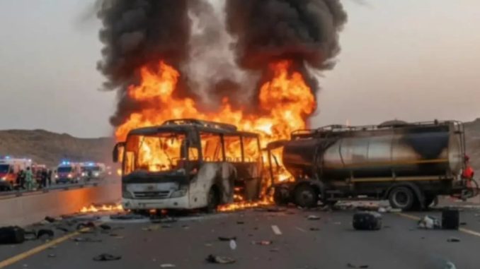 Kecelakaan melibatkan tabrakan antara bus pariwisata dan truk tangki pengangkut solar di kawasan Mufrihat, sekitar 450 km dari Makkah.